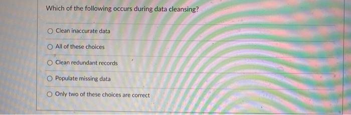 Solved Which Of The Following Occurs During Data Cleansing Chegg Com